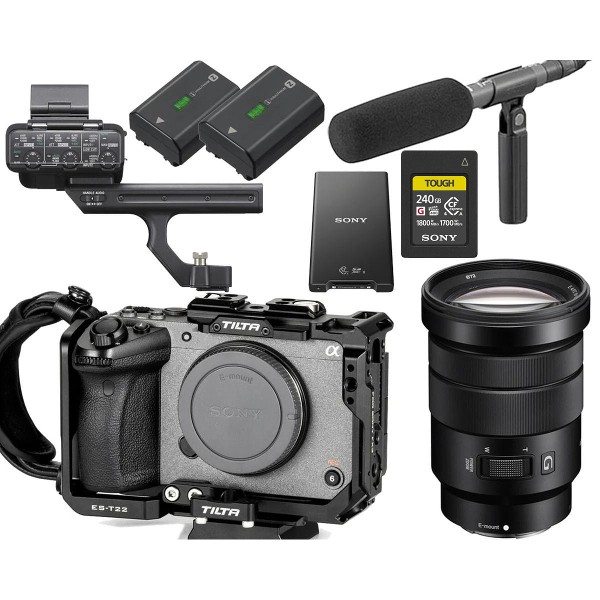 Sony FX30 Cinema Camera Pro Kit 包含内容创作者入门所需的一切,包括一块备用电池、带读卡器的 80GB CFExpress 存储卡以及用于安装配件的完整相机支架。这样一来,开箱即可轻松开始拍摄高质量视频。