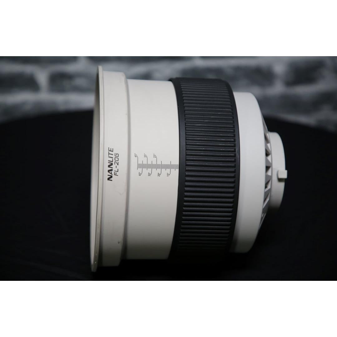 Great condition Nanlite FL-20G Fresnel attachment with barn doors. This accessory provides a 20°–80° variable beam angle, allowing precise control of light spread when paired with compatible Nanlite fixtures. The included barn doors offer additional shaping and spill control, making it ideal for studio, interview, and creative lighting setups.